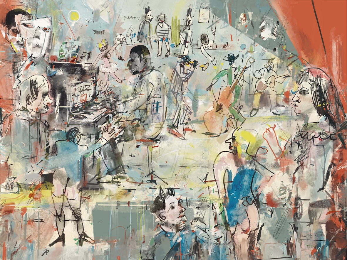 These works emerge from the artist’s own sketches, drawn over time and brought together into layered compositions. Figures and gestures drift across the surface, overlapping and dissolving, without a fixed narrative.